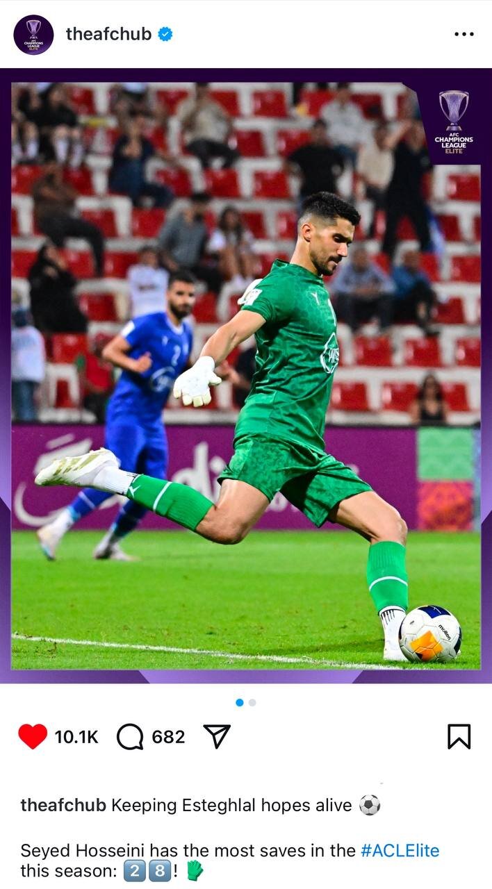 در ادامه کپشن این پست هم اشاره شده سید حسین حسینی با ۲۸ مهار توپ در این فصل، بیشترین سیو را در لیگ نخبگان آسیا داشته است.