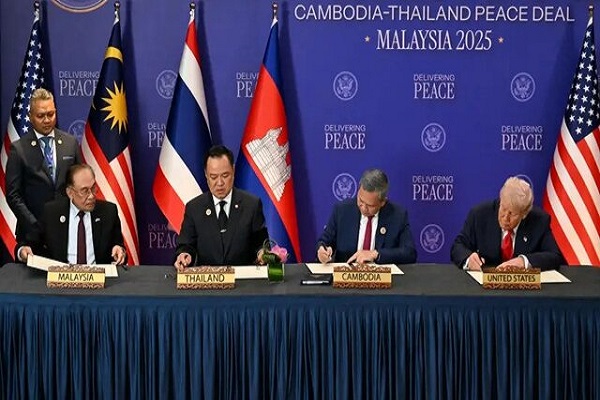 «دونالد ترامپ»، رئیس جمهور آمریکا نظارهگر امضای آتشبس گسترده توسط نخست وزیر کامبوج، «هون مانت»، و نخست وزیر تایلند، «آنوتین چارنویراکول»، در اجلاس سالانه انجمن ملل جنوب شرقی آسیا (آسهآن) در مالزی، اندکی پس از ورود ترامپ، بود.