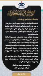 روابط عمومی پتروشیمی خارک با صدور اطلاعیه ای مصیبت وارده را به دکتر کمیل پورضیائی مدیر عامل این شرکت تسلیت عرض می نمایید.