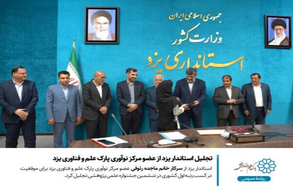 به گزارش مرز اقتصاد، استاندار یزد از خانم ماجده رئوفی عضو مرکز نوآوری پارک علم و فناوری یزد برای موفقیت در کسب رتبه اول کشوری در ششمین جشنواره علمی پژوهشی تجلیل کرد.